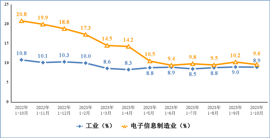1-10月份,电子信息制造业固定资产投资同比增长9.6%,比同期工业投资增速高0.7个百分点,但比高技术制造业投资增速低1.7个百分点。